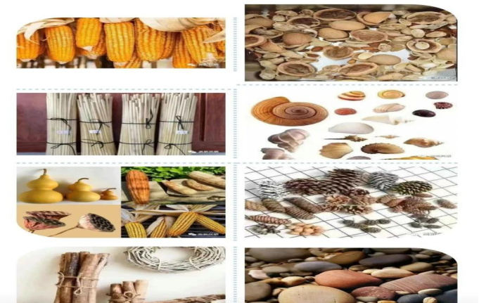 各种贝壳、干果壳、松果、玉米棒、玉米皮、核桃壳、大小葫芦、麦秸、鹅卵石、芦苇。