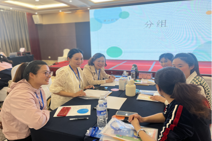 研讨会上,参会人员根据颜色标贴进行分组,并在小组内自我介绍。随后通过案例表演的形式,现场展示了融合教育家园共育中的真实场景,引发了大家的深入讨论。
