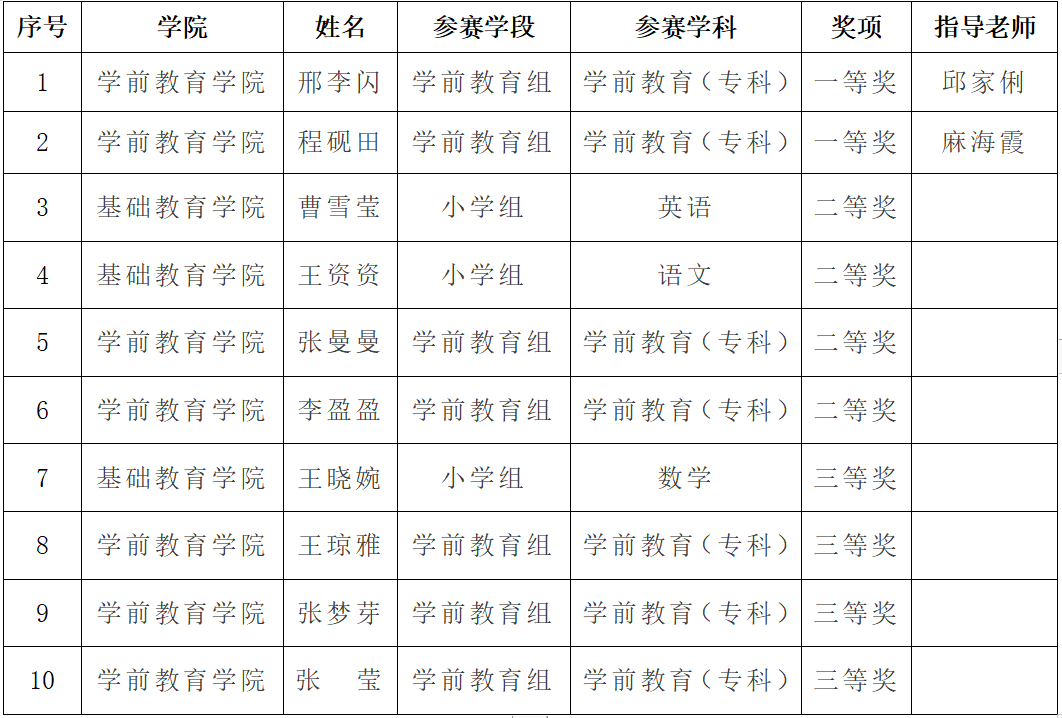 学前教育学院2021级学前教育专业邢李闪、程砚田两位学生代表我校参加了现场决赛。经过微课展示、现场答辩、才艺展示三个环节的比拼,凭借良好的精神风貌和扎实的教学能力,在河南省61所高校的184位参赛选手中脱颖而出,双双荣获一等奖!另有八名学生推送视频材料参与比赛,分别获得了4个二等奖和4个三等奖。参赛学子发挥出色,展现了我校学生良好的教学技能和专业素养,充分体现了我校师范生培养成效。