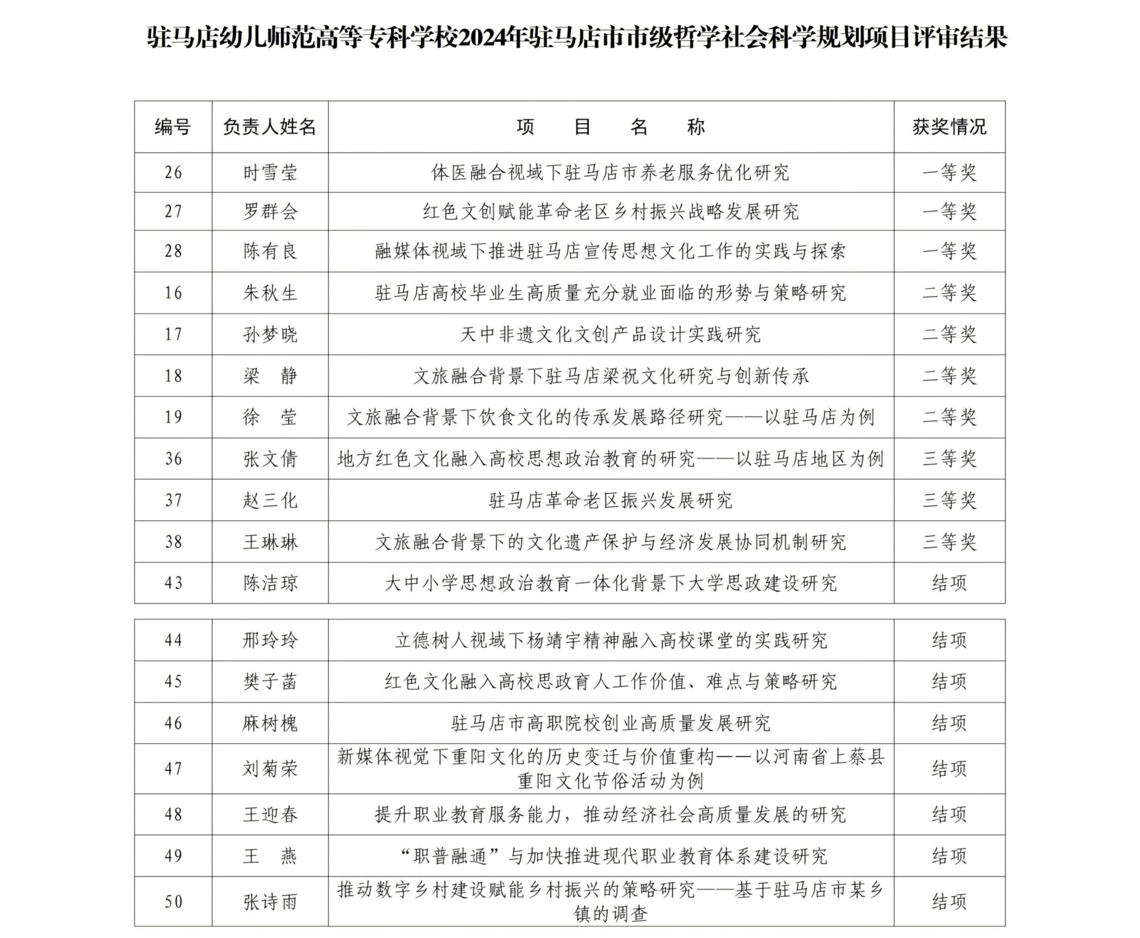 根据驻马店市社科联发布的《关于公布2024年驻马店市市级哲学社会科学规划项目结项与评审结果的通报》(驻社科〔2024〕9号),在此次评审中,我校18项立项课题全部结项,其中10项课题获奖。现将结项名单及获奖情况予以公布: