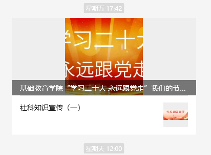 各学院还利用本学院线上公众号积极宣传社科知识。如基础教育学院利用“基础青年”公众号定期推送社会科学知识宣传100题,应用技术学院利用“应用微学工”公众号设置多个相关栏目进行宣传。