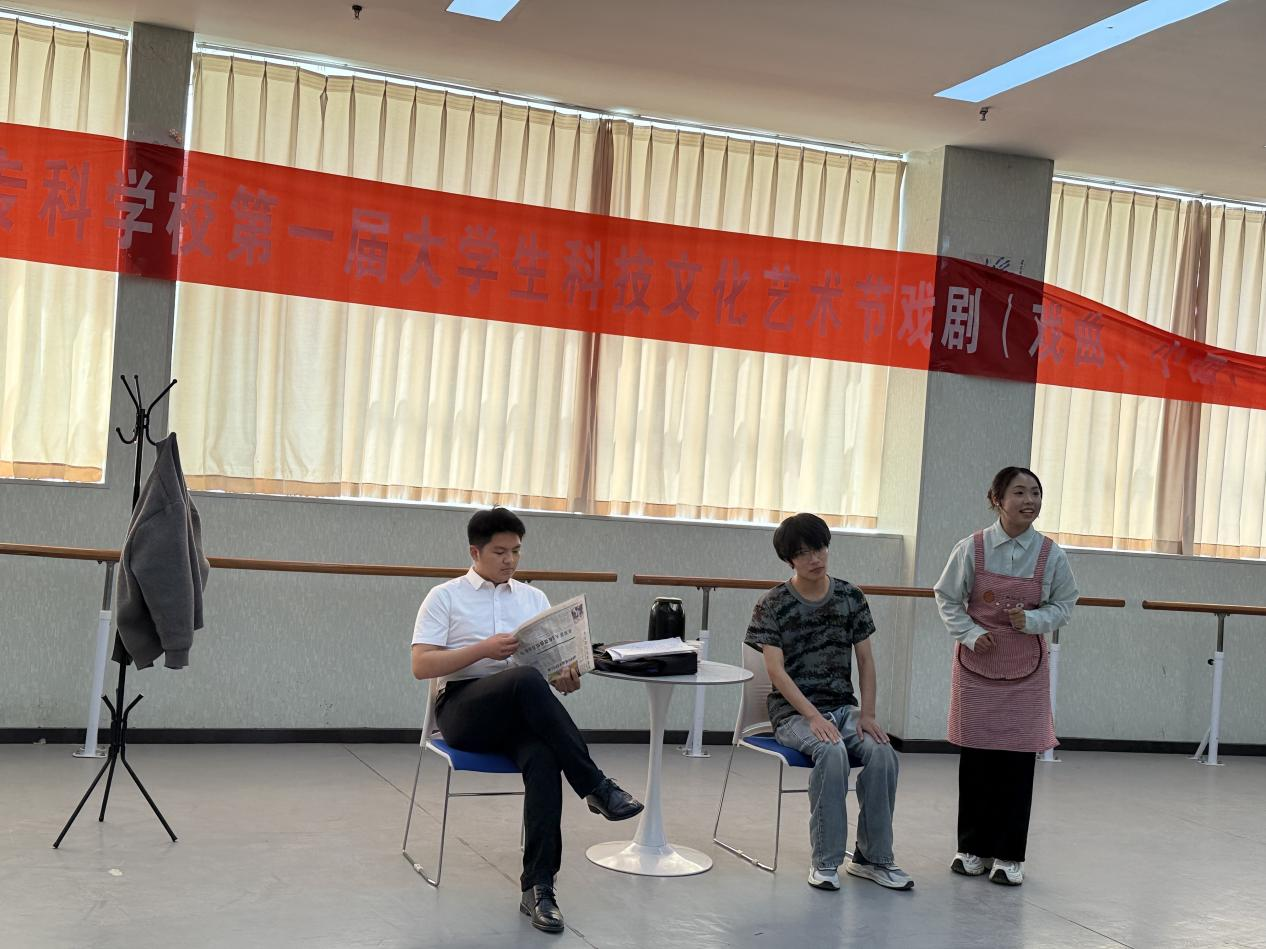4月15日下午,由校党委宣传统战部、校团委主办的我校第一届大学生科技文化艺术节戏剧(戏曲、小品、话剧)大赛在艺术楼啦啦操教室一精彩上演。
