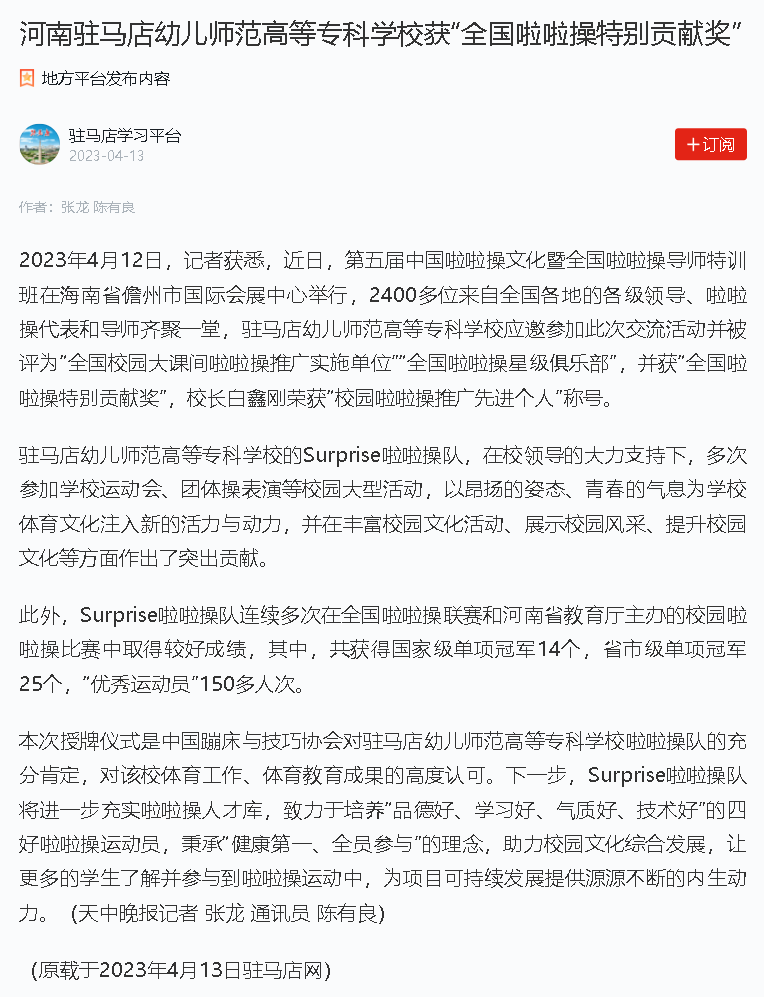下一条:天中晚报:驻马店幼专获“全国啦啦操特别贡献奖”