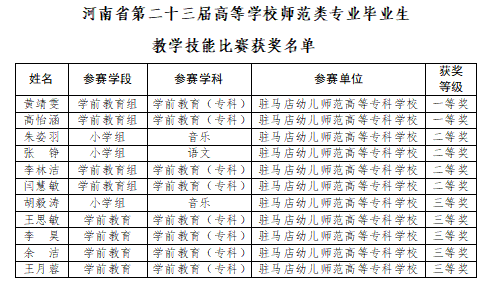2025年11月24日河南省教育厅教办师〔2025〕308号文公布了第二十三届高等学校师范类专业毕业生教学技能比赛结果,在本次大赛中,我校师生再创佳绩,学校选派的两名现场赛选手在学前教育专科组比赛中发挥出色,以该组别第二、第三名的优异成绩双双荣获一等奖。同时报送的四名同学的微课视频作品也在评审中脱颖而出,全部荣获二等奖。此外,另有五项选手获得三等奖,彰显了学校师范教育高质量发展的成效和实力。