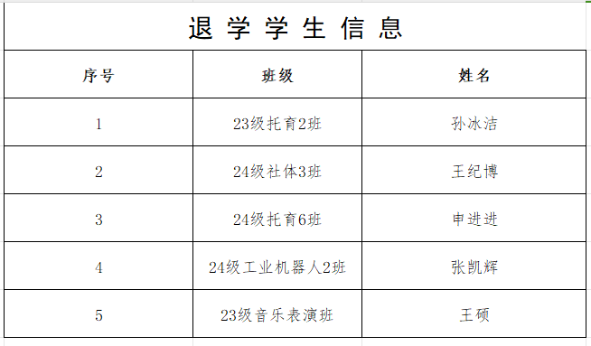 根据教育部41号令和《驻马店幼儿师范高等专科学校学生学籍管理规定》,经校长办公会研究,批准孙冰洁等5名学生的退学申请现予以公示,公示时间:2025年10月22日-10月24日(共3天)。公示结束后在学信网注销其学籍,公示期间如有异议请与教务处联系。