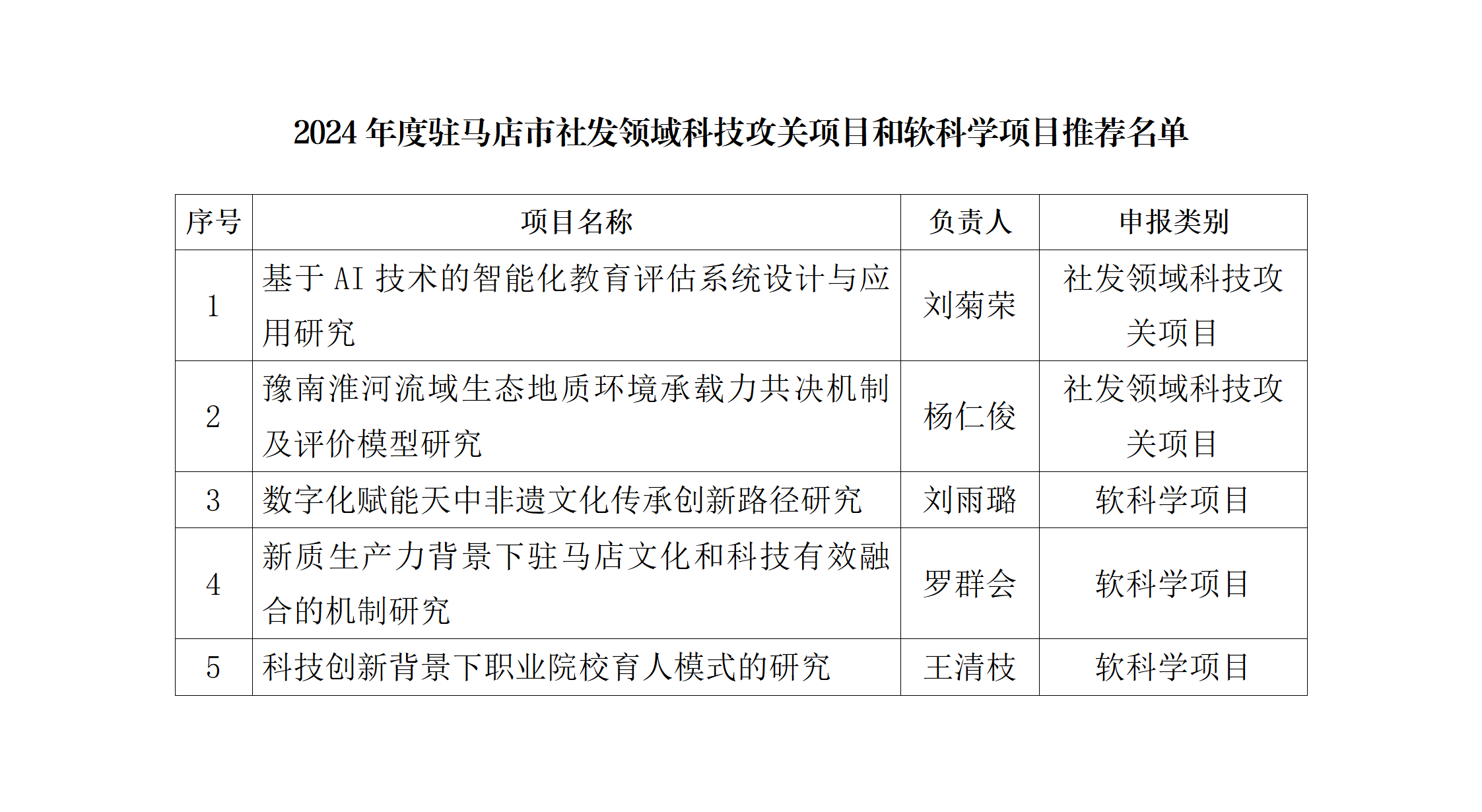 根据《驻马店市科学技术局、市财政局关于组织申报2024年度驻马店市社发领域科技攻关项目和软科学项目的通知》,经教师个人申报、科研处审核、学校组织专家组匿名评审,拟推荐项目公示如下: