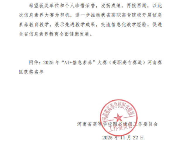 数字赋能成长,AI点亮未来!11月24日,2025年“AI+信息素养”大赛(高职高专赛道)河南赛区教师微课赛暨学生决赛评奖结果公布,我校“超级幸运三大侠队”“智识信数队”分别斩获省级二、三等奖!学校荣获“最佳组织奖”,高莹莹老师获评省级“先进工作者”。
