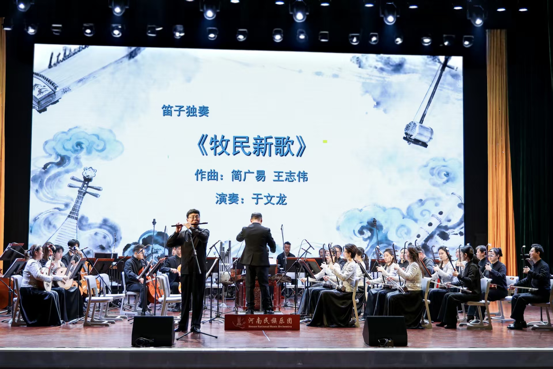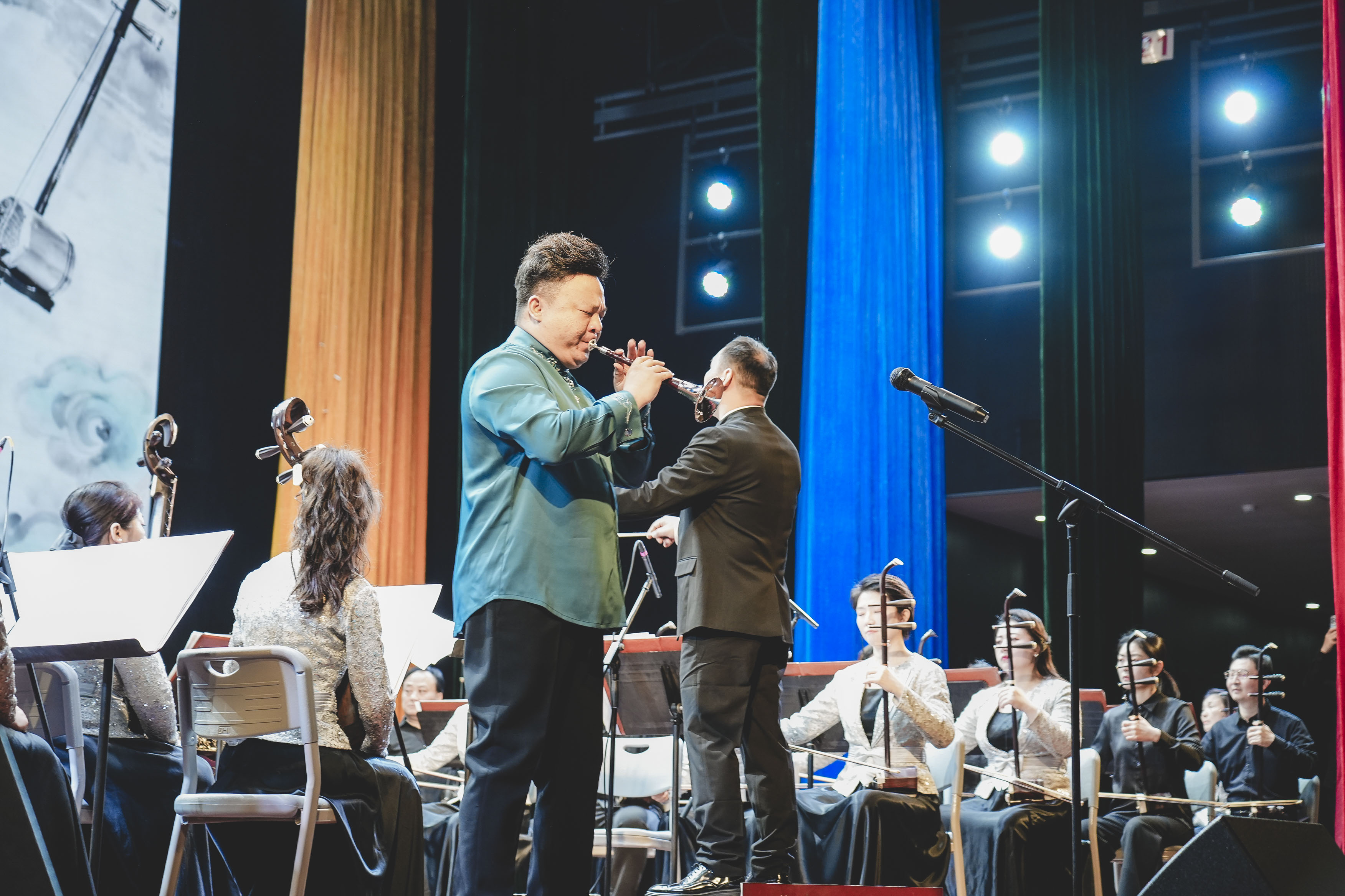 音乐会在气势恢宏的民族管弦乐《将军令》中拉开帷幕,古曲新编的旋律瞬间点燃现场氛围;笛子独奏《牧民新歌》以悠扬的曲调勾勒出草原牧歌的辽阔意境,弹拨乐合奏《驼铃响叮当》则以灵动的节奏传递出西域风情。《菊花台》中二胡与大提琴的跨界融合,让传统民乐与流行元素碰撞出独特火花;而唢呐独奏《百鸟朝凤》以惟妙惟肖的“鸟鸣”技巧,将音乐会推向高潮。“乐器知识介绍”环节,主持人结合乐器展示,生动科普了民族器乐文化,让师生在欣赏中收获知识。尾声处,改编版的《云宫迅音》《就是哪吒》《射雕英雄传》等影视金曲,引发全场共鸣,现场气氛热烈非凡。