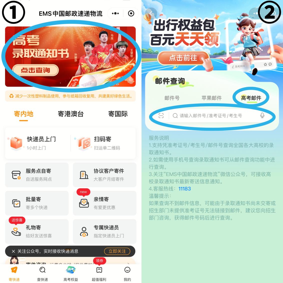 方式三:微信搜索或者扫描二维码进入“国家政务服务平台”小程序。国家政务服务平台已接入中国邮政EMS提供的高考录取通知书查询服务,输入准考证号或邮件号即可了解高考录取通知书当前寄递信息。操作步骤如下图所示:
