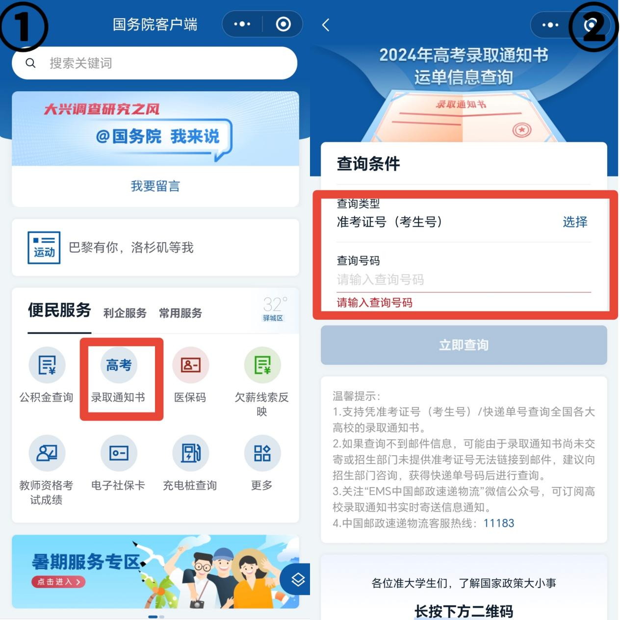 方式四:微信搜索进入“国务院客户端”小程序,输入准考证号或邮件号即可了解高考录取通知书当前寄递信息。操作步骤如下图所示: