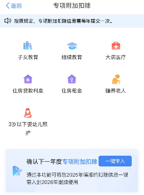 在手机上打开个人所得税App,在首页选择“2026年度专项附加扣除填报”。如果之前已填且明年无变化,只需点击“一键带入”,即可完成确认。