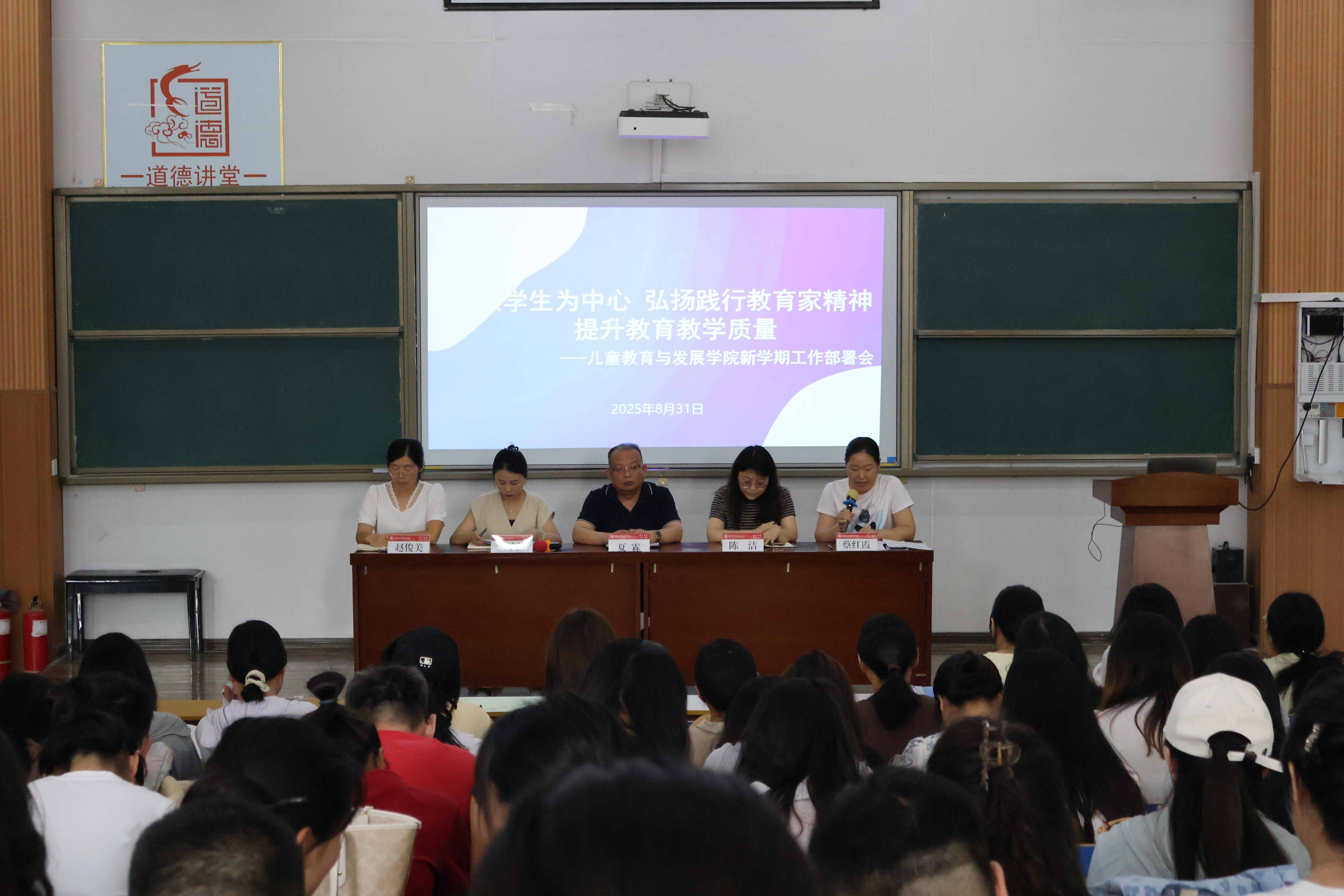 8月31日下午,儿童教育与发展学院在一楼阶梯教室召开2025年秋季新学期工作部署会。学院负责人夏霖、党总支副书记樊子菡、副院长蔡红霞、副院长赵俊美、人事处副处长陈洁及全体教职工参会,会议由樊子菡主持。
