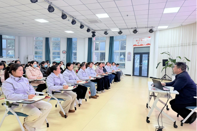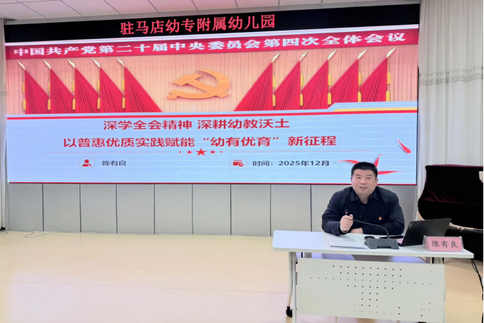 为全面、系统地学习贯彻中国共产党第二十届中央委员会第四次全体会议精神,并将其核心要义转化为推动学前教育高质量发展的具体实践,驻马店幼专附属幼儿园于2025年12月25日,特邀驻马店幼儿师范高等专科学校党委组织部部长陈有良同志来园,为全体教职员工讲授了题为“深学全会精神,深耕幼教沃土,以普惠优质实践赋能‘幼有优育’新征程”的专题党课。本次活动旨在统一思想、凝聚共识,激励全体教职工将国家宏观战略与学前教育本职工作紧密结合。