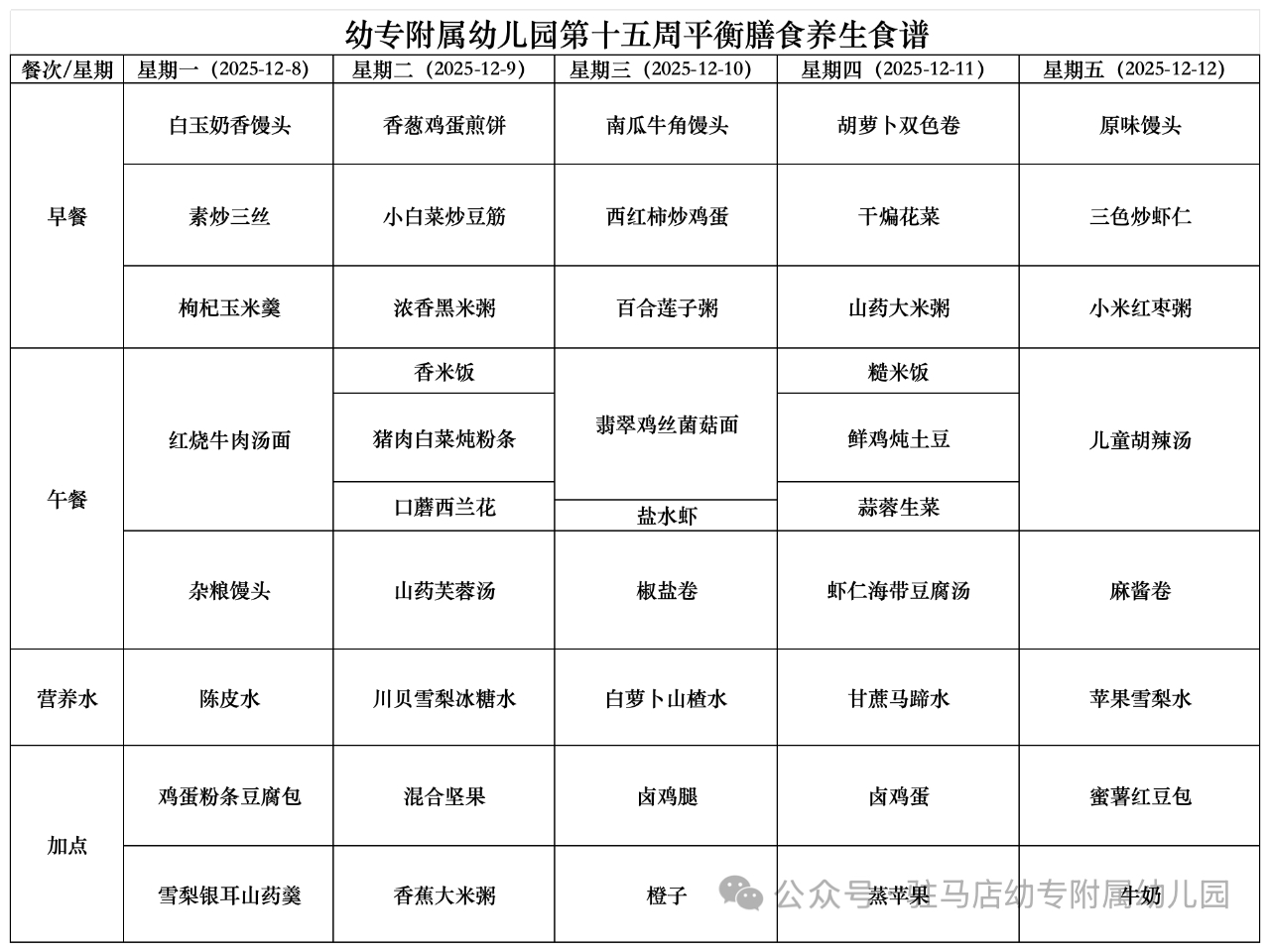 【幼儿食谱】驻马店幼专附属幼儿园2025年秋季第十五周平衡膳食养生食谱