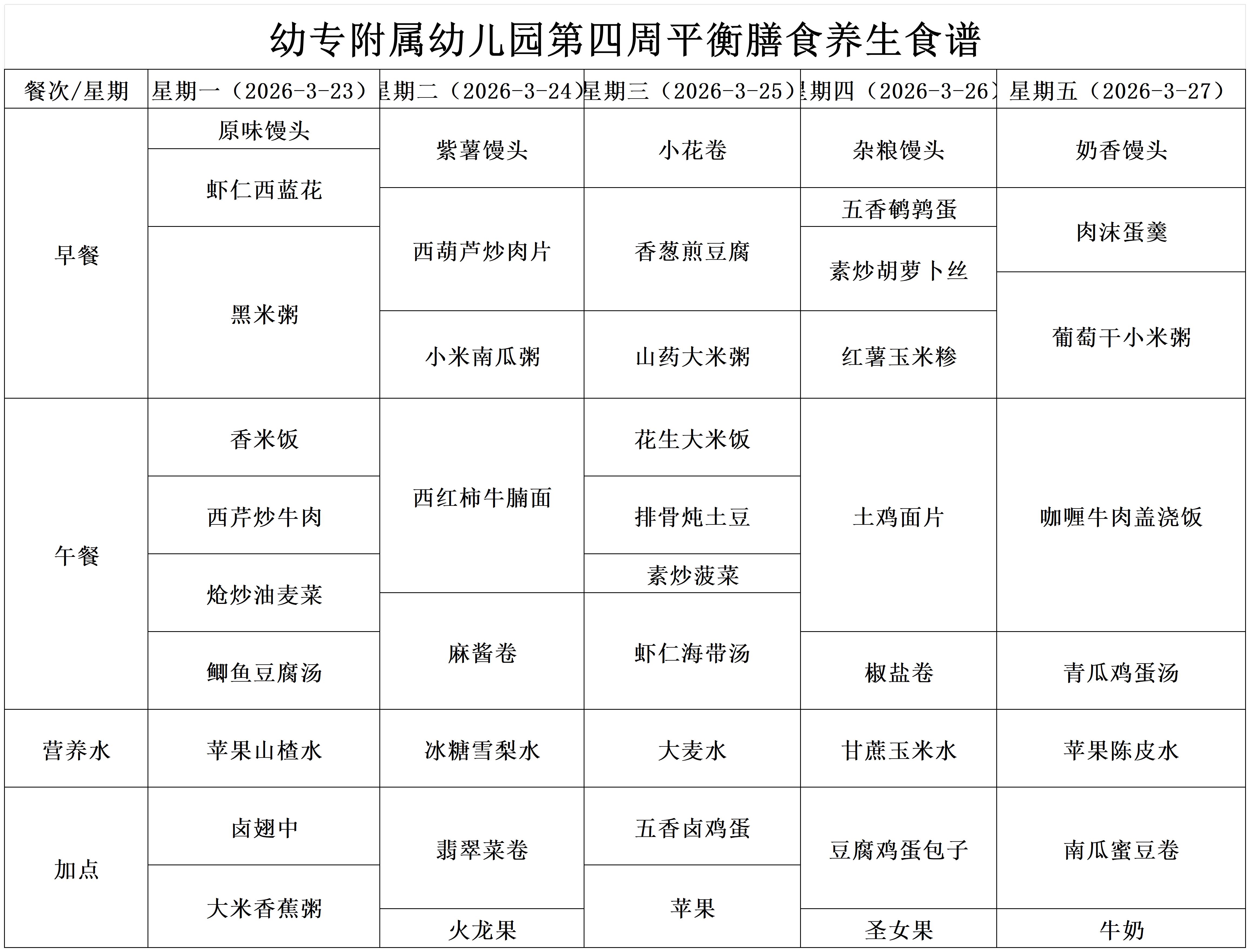 【幼儿食谱】驻马店幼专附属幼儿园2026年春季第四周平衡膳食养生食谱