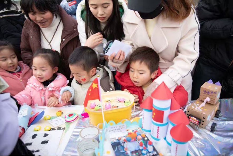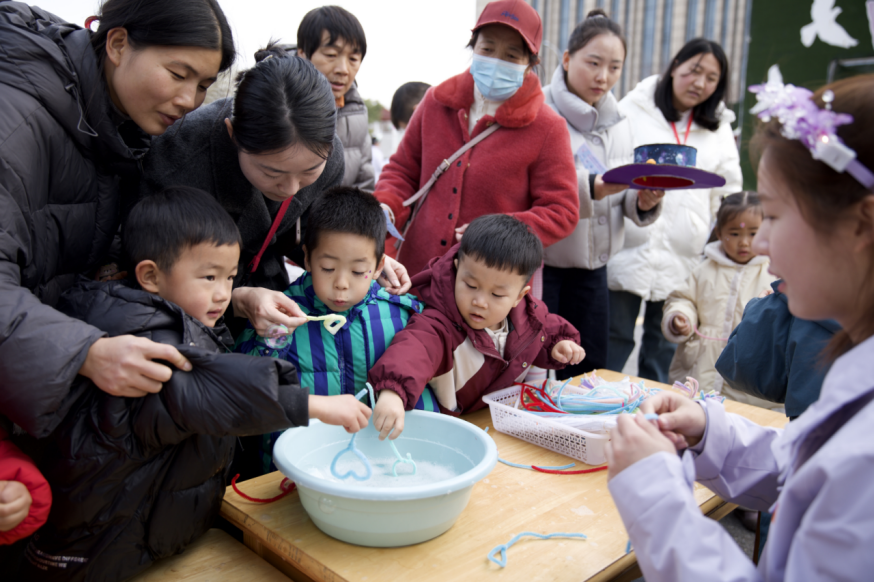 C区·互动表演区:这里成为了想象力与动手能力的练兵场。从泡泡器DIY到保鲜膜彩绘,孩子们在“做中学”、“玩中学”,亲身实践着“十四五”规划中倡导的“知行合一”的教育理念,在欢声笑语中尽情释放艺术天性。