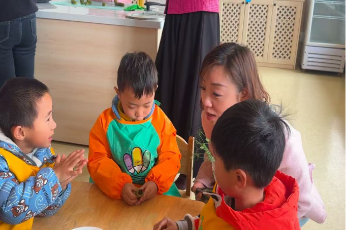 大三班小朋友在大灶台蒸制春菜,榆钱窝窝、面条菜、胡萝卜等新鲜的春菜在大灶台上散发着诱人的香气,还有美味的地锅鸡,现场充满了欢声笑语,洋溢着浓浓的生活气息。