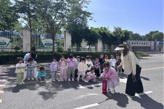地震演练结束后,郜老师带领各年级组教师与幼儿在东交通区进行了灭火器使用讲解,详细介绍灭火器使用的“提拔握压”四字口诀(一提灭火器、二拔保险销、三握软管瞄准、四压把手喷射),并通过消防知识小问答与小朋友们进行互动,接着,各班主班教师带幼儿进行分散演练。