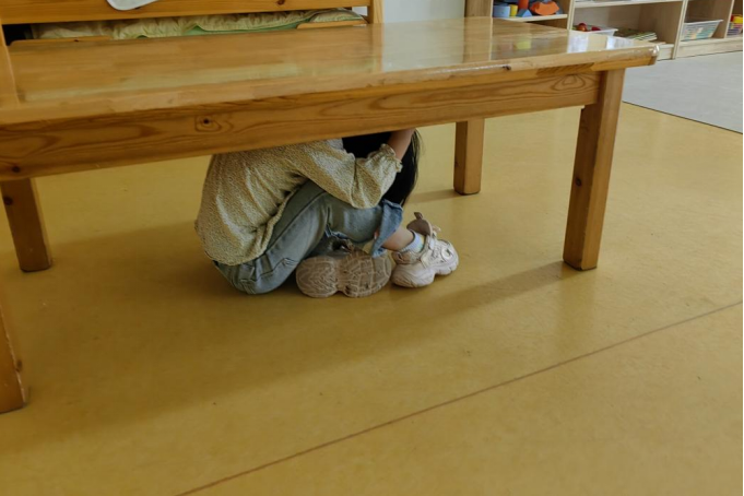 本次地震演练打破常规,实行无预警演练,仅提前告知教职工演练日期,不通知具体时间,全体师幼直面“突发”挑战。当日上午9时05分,幼儿园突然拉响警报(模拟主震波),此时托小班各班正在进行餐后整理活动、中大班进行绘本阅读、大班进行户外活动前准备活动,教师在“零准备”状态下迅速判断险情,启动应急响应,并指导幼儿双手护头、蹲在课桌下、教室承重墙角落等,孩子们用双手护着自己的头,快速躲到了教室的安全地带或桌子底下。