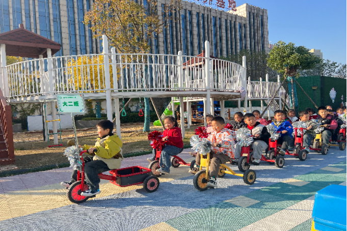 大二班的“小骑士”们脚踩自行车,化身追风少年,成为入场式上一道亮丽的风景线;