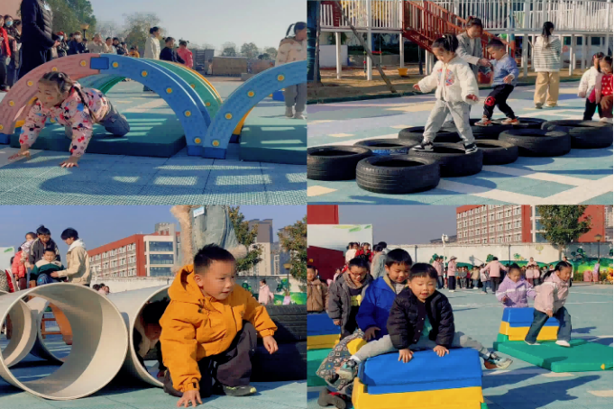 首先进行的“运动大循环”环节,孩子们在爬、平衡、攀跳、跳山羊、钻等一系列挑战中,尽情释放运动活力,展现了出色的身体素质和勇敢的意志品质。