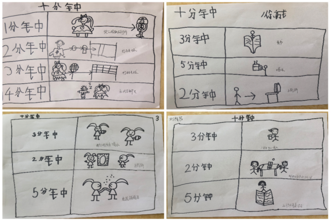 为了让孩子真正理解时间、感受时间,我们开展了“一分钟体验”活动。通过亲身体验,孩子们发现一分钟虽然短暂,却可以完成跳绳10下、完成一幅画的底色铺设等具体事项。