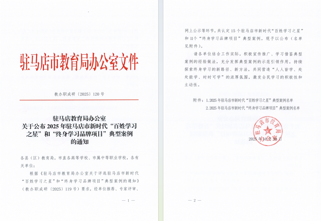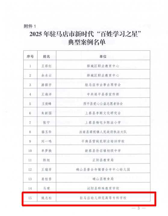 近日,驻马店市教育局公布了2025年全市新时代“百姓学习之星”与“终身学习品牌项目”典型案例评选结果。我校姚志松教授成功入选,斩获“百姓学习之星”荣誉称号。此项荣誉实现了我校在市级全民终身学习评选项目中“零的突破”,标志着我校在服务全民学习、终身学习型社会建设方面迈出了坚实的一步,具有重要的里程碑意义。