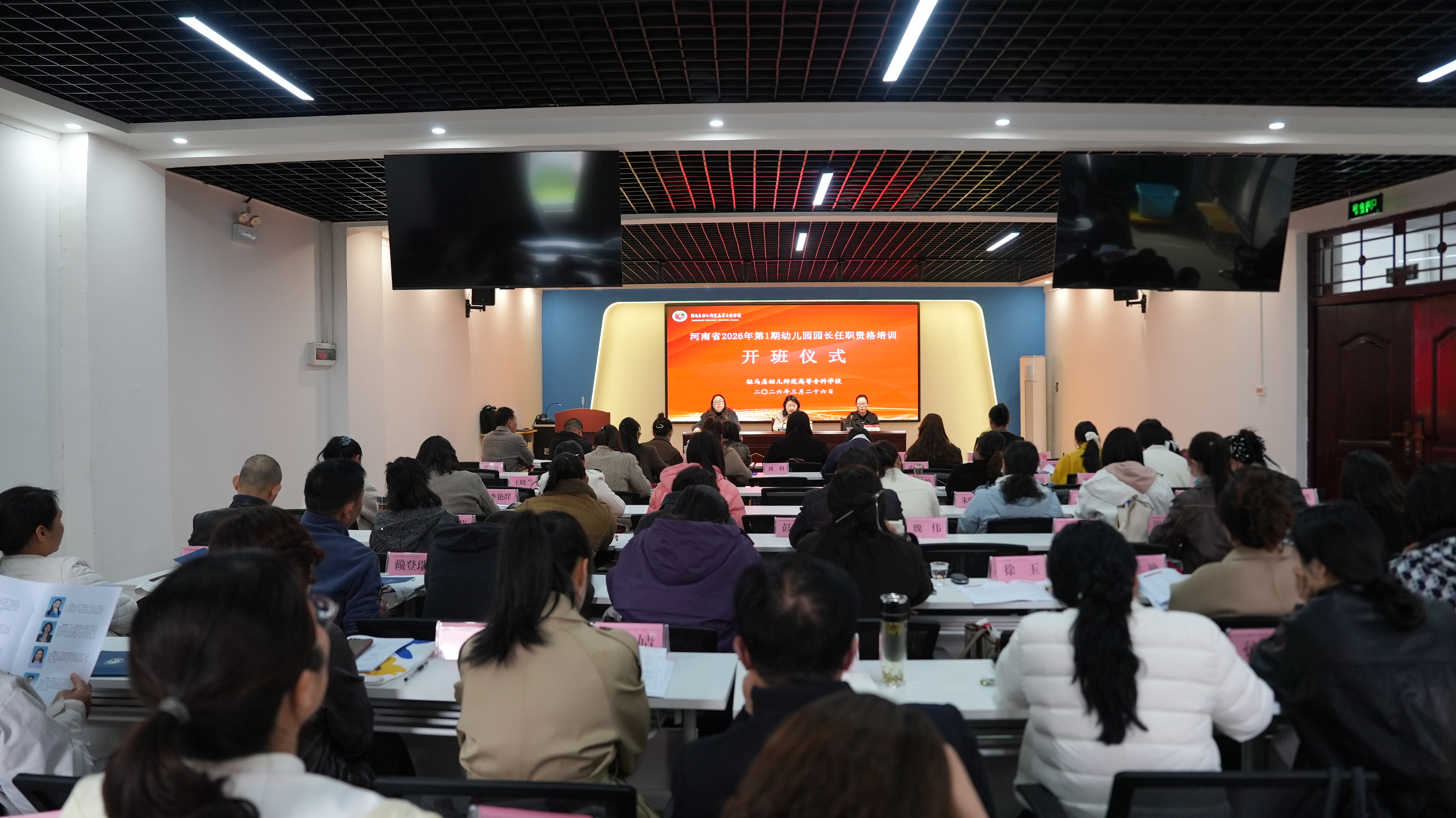 3 月 26 日上午,河南省 2026 年第 1 期幼儿园园长任职资格培训班在我校实训楼B109正式开班。我校副校长刘晓红、对外合作与继续教育处处长乔叶青以及来自驻马店九县一区的 78 名幼儿园园长参加开班仪式。仪式由对外合作与继续教育处副处长段彩云主持。