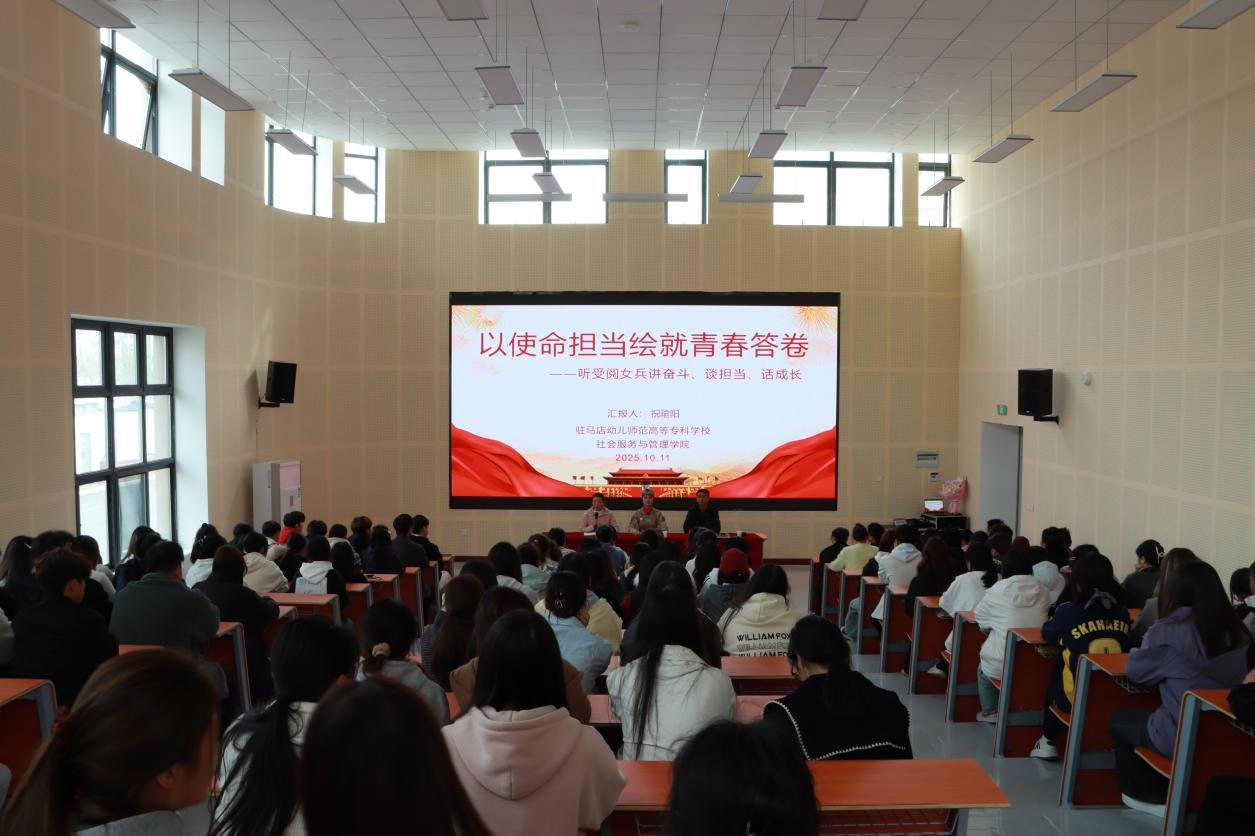 为充分发挥先进典型的榜样示范作用,将爱国主义教育与学风建设深度融合,10月11日,社会服务与管理学院在6111阶梯教室成功举办“以使命担当绘就青春答卷”专题报告会。学院特邀抗战胜利80周年阅兵女民兵方队成员、确山县竹沟镇基层干部祝瑜阳同志分享其非凡经历与感悟。学院党总支书记李领、副院长徐洁及全院师生代表共同与会,报告会由徐洁主持。