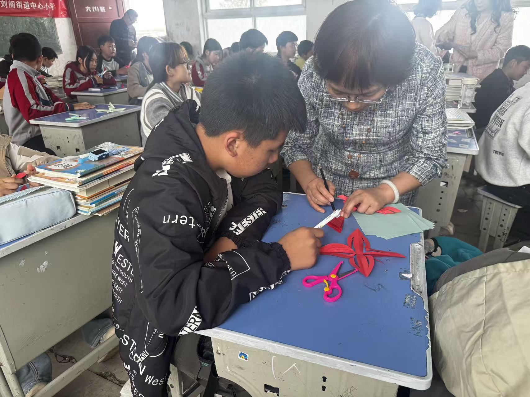 在实际操作环节,孩子们表现出极大的兴趣与热情。在老师和大学生志愿者一对一的帮助下,他们小心翼翼地将彩纸折叠,用铅笔勾勒出雪花的轮廓,再拿起剪刀认真裁剪。尽管手法尚显稚嫩,但每一双眼睛里都闪烁着专注与创造的光芒。不一会儿,一幅幅形态各异、精巧可爱的雪花剪纸在孩子们手中“绽放”,教室里仿佛飘起了温暖的“春雪”。