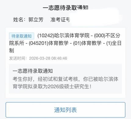 2024年,她凭借扎实的知识储备,顺利通过河南省专升本考试,进入安阳师范学院继续深造。本科阶段,她依旧坚守初心,明确学习目标,积极参与社会实践与专业实践,不断积累经验、提升能力。备考研究生期间,她顶住压力、脚踏实地,最终在2026年全国硕士研究生招生考试中脱颖而出,成功被哈尔滨体育学院录取,实现了从专科到硕士的华丽跨越。