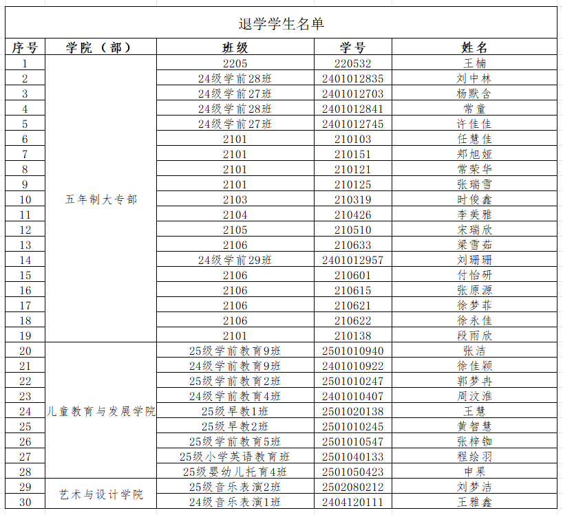 根据《普通高等学校学生管理规定》(教育部令第41号)文件精神,按照《驻马店幼儿师范高等专科学校学生学籍学历管理制度》(驻马店幼专〔2022〕77号)相关文件精神,经学校党政联席会研究,同意对王楠等30名学生予以退学处理,注销学籍。现进行公示,公示期为2026年4月9日至4月13日,如有异议,请在此期间内到教务处提出书面申诉。