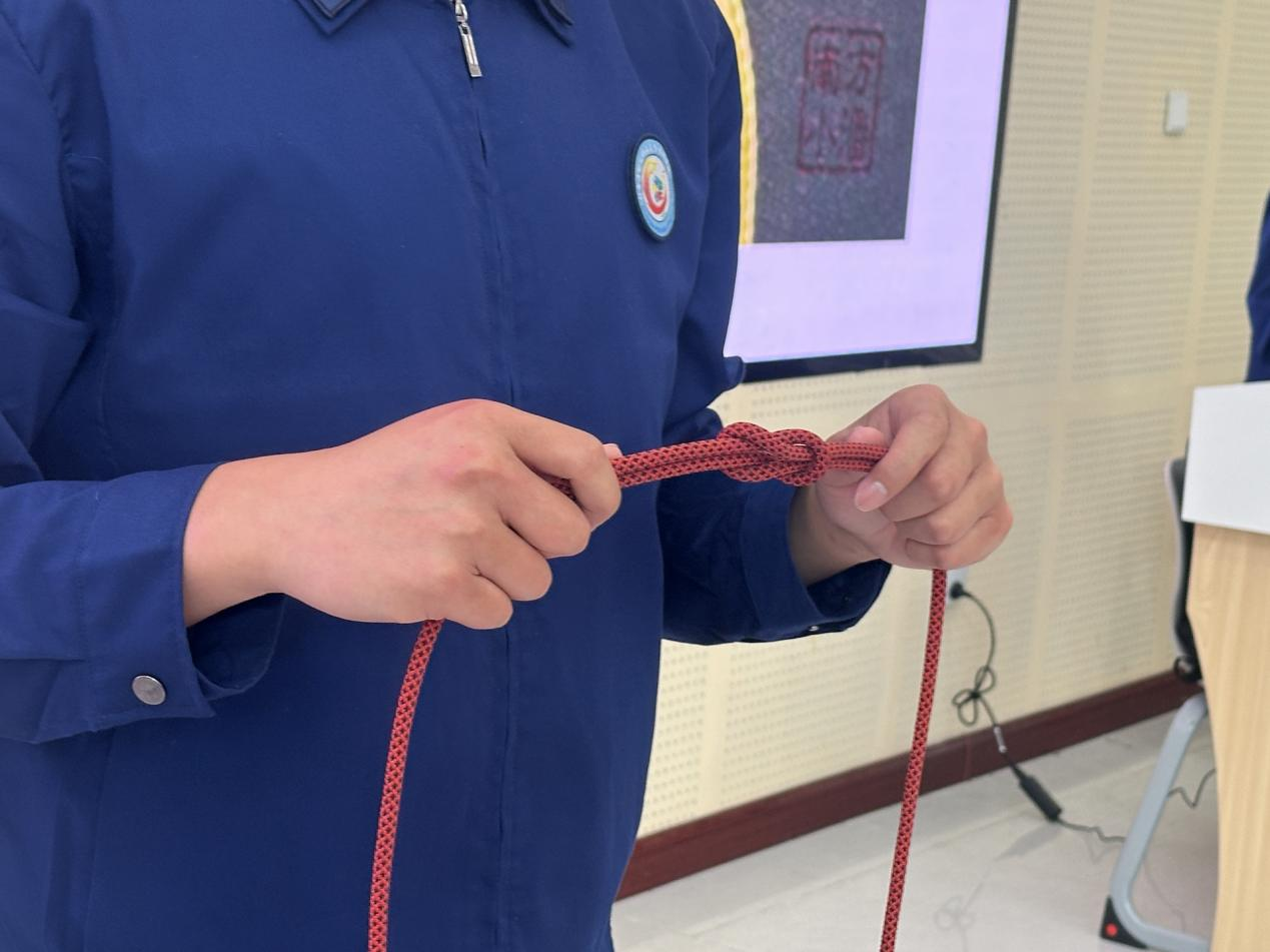 活动伊始,张慧冉同学以真实火灾案例为切入点,通过PPT展示,让同学们直观感受到火灾的突发性与危害性,深刻认识到“防患于未然”的重要性;随后,重点讲解了灭火器的正确使用方法,帮助同学们掌握扑灭初期火灾的关键技能;针对高楼层逃生等复杂情况,现场演示了八字结、双平结、床单连接结等绳索打结技巧。在实操环节,同学们踊跃参与、认真练习、互相配合,现场气氛热烈有序。