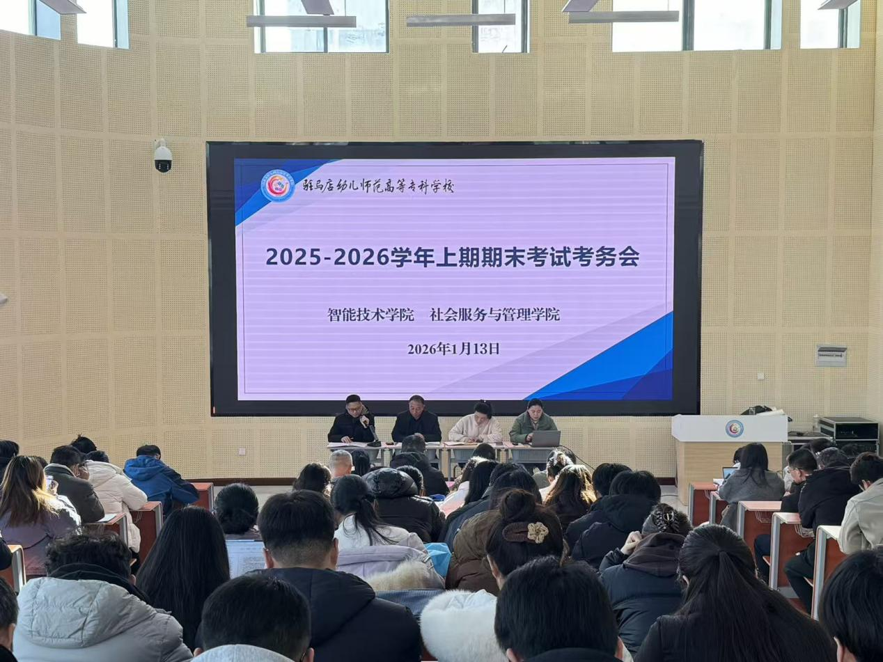为全面部署期末考试工作,进一步规范考试管理、严肃考风考纪,确保期末考试相关工作有序开展,社会服务与管理学院与智能技术学院于1月13日下午在秀山校区4111阶梯教室共同召开2025-2026学年上学期期末考试考务工作会议。会议由王新乔主持。