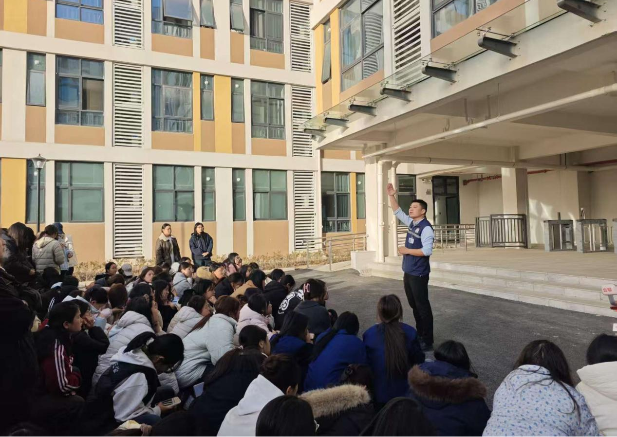演练正式启动前,学院特邀宣安消防的许阳同志为同学们开展逃生技能培训。结合宿舍楼通道狭窄、人员密集的场景特点,许阳用通俗易懂的语言,详细讲解了火灾逃生核心要点:遇到火情需保持冷静、低姿弯腰贴墙前行、用湿毛巾严密捂住口鼻,同时明确了疏散路线、紧急避险位置及集合清点流程,让同学们清晰掌握“怎么逃、逃向哪”的关键逻辑。