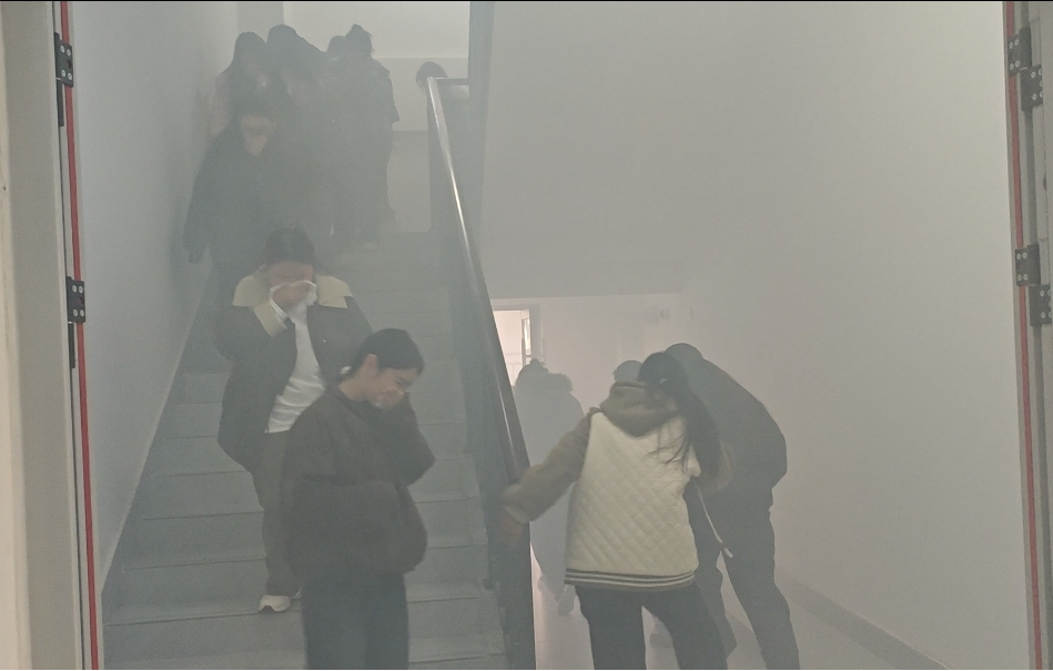 培训结束后,演练模拟火情正式上演。随着烟雾弹被点燃,宿舍楼内迅速弥漫起模拟浓烟,现场氛围紧张而有序。听到疏散指令后,同学们严格按照所学技巧,快速做好防护措施,在工作人员的引导下,沿着预定疏散路线快速、有序地撤离至宿舍楼外安全区域。整个撤离过程紧张高效,无拥挤、推搡现象,充分展现了同学们良好的应急素养。