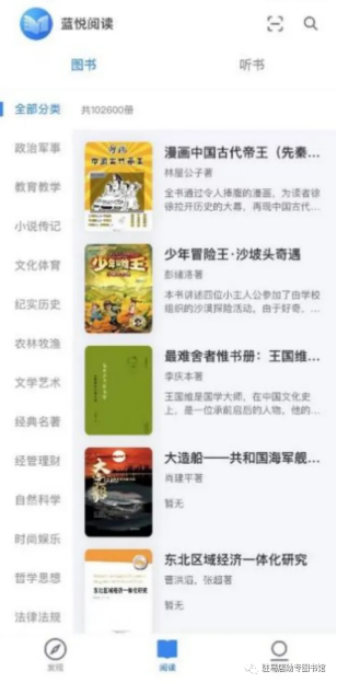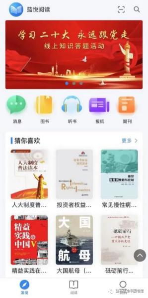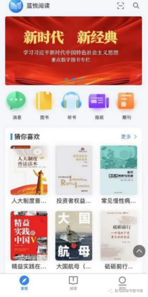 消息、图书、听书、报纸、期刊为导航模块;