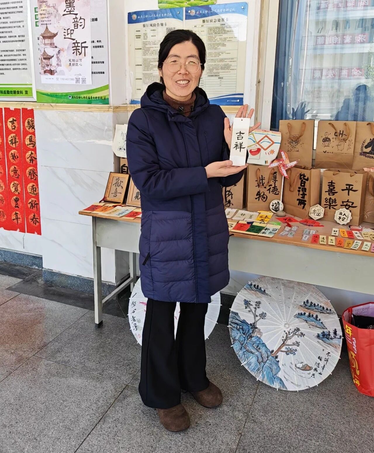 1月13日举办的写春联体验活动将现场氛围推向高潮。师生们提笔书写“骏马迎新春,墨韵添喜气”等春联,在传统节日仪式中寄托新年愿望。活动现场,同学们还在扇面、伞面等日常载体上进行创作,将书法题字与绘画造景相结合,使艺术自然融入生活。