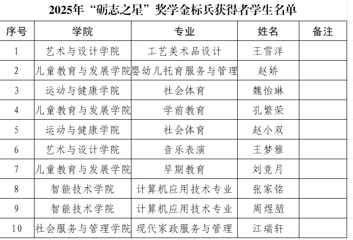 经严格评选、综合评定,最终共有 10 名同学脱颖而出,荣获 “砺志之星” 暨榜样・力量奖学金标兵荣誉称号。具体名单如下: