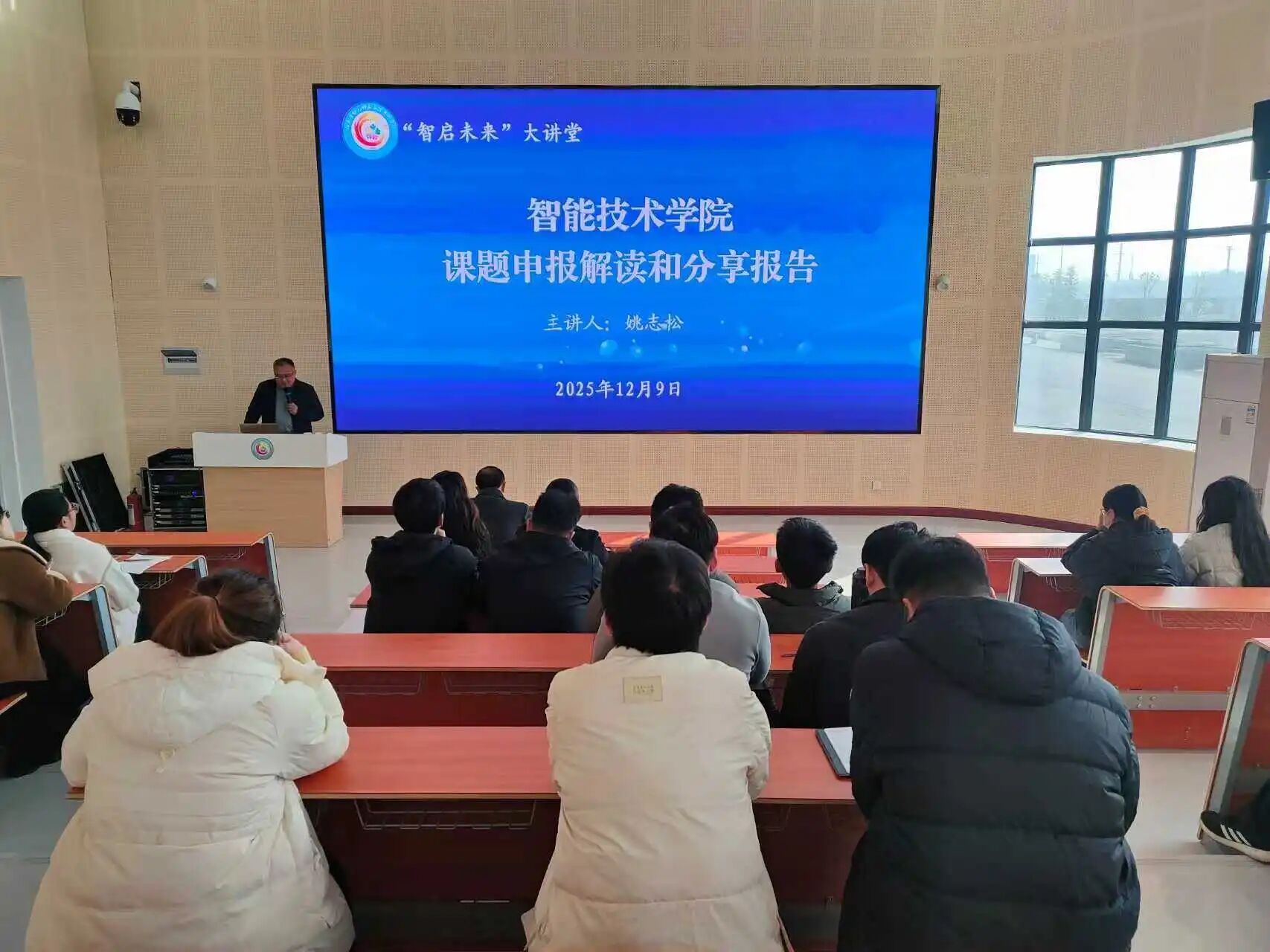 为提升学院教师专业素养,助力教师夯实科研基础、提升课题研究质量,12月9日下午,智能技术学院在3111阶梯教室组织开展“智启未来”大讲堂活动,科研处处长姚志松主讲,全院教师积极参与,共同探寻科研课题研究的有效路径。