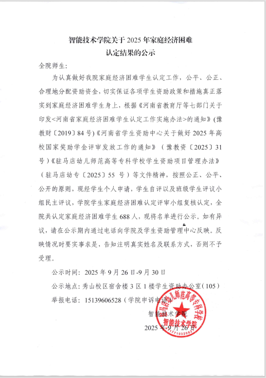 智能技术学院关于2025年家庭经济困难认定结果的公示