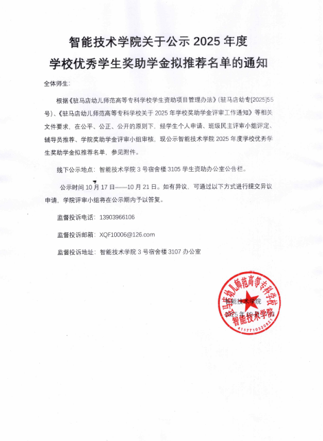 智能技术学院关于公示2025年度国家奖助学金拟推荐名单的通知